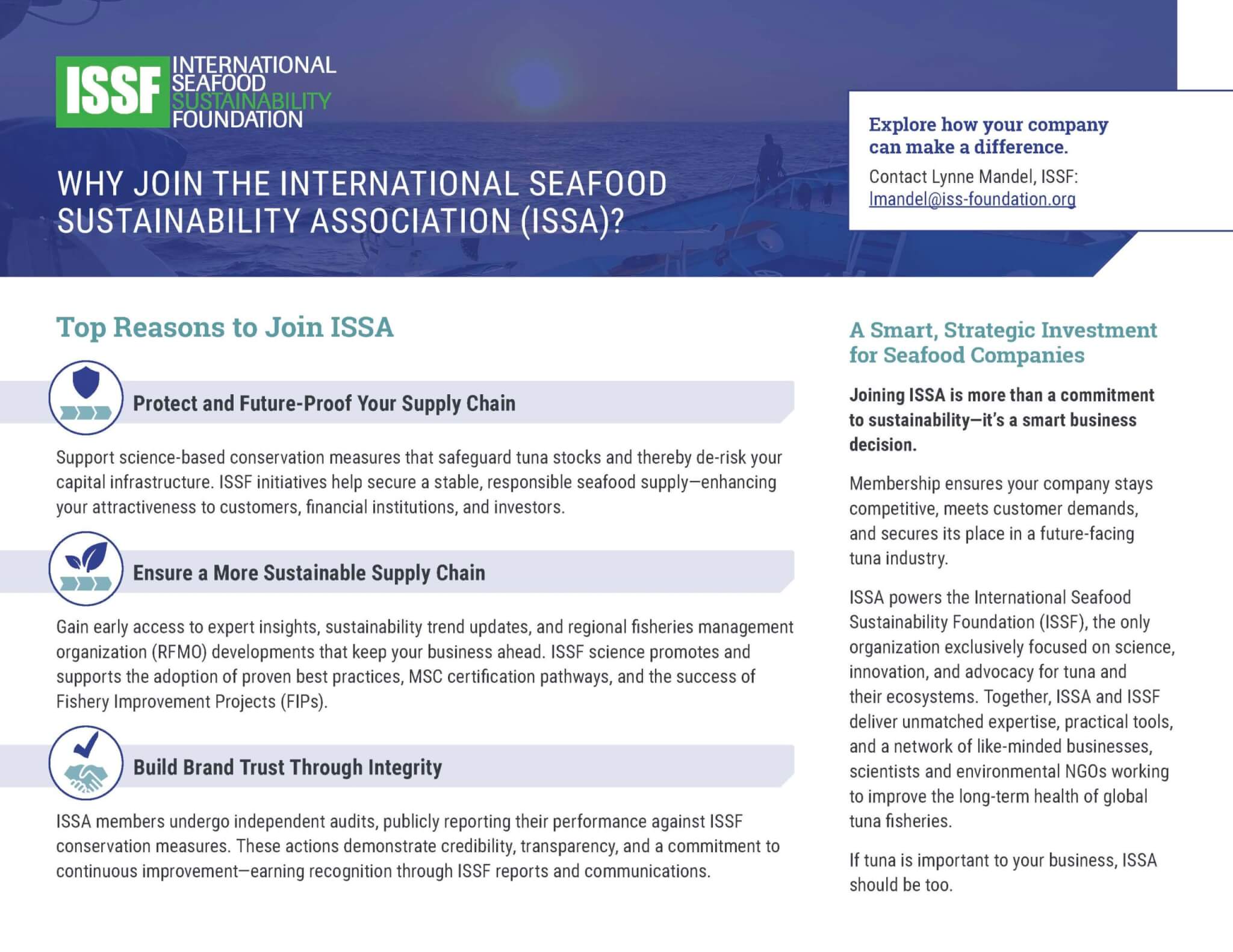 Content about the International Seafood Sustainability Association (ISSA), a non-profit trade association and the sole voting member of the International Seafood Sustainability Foundation (ISSF).