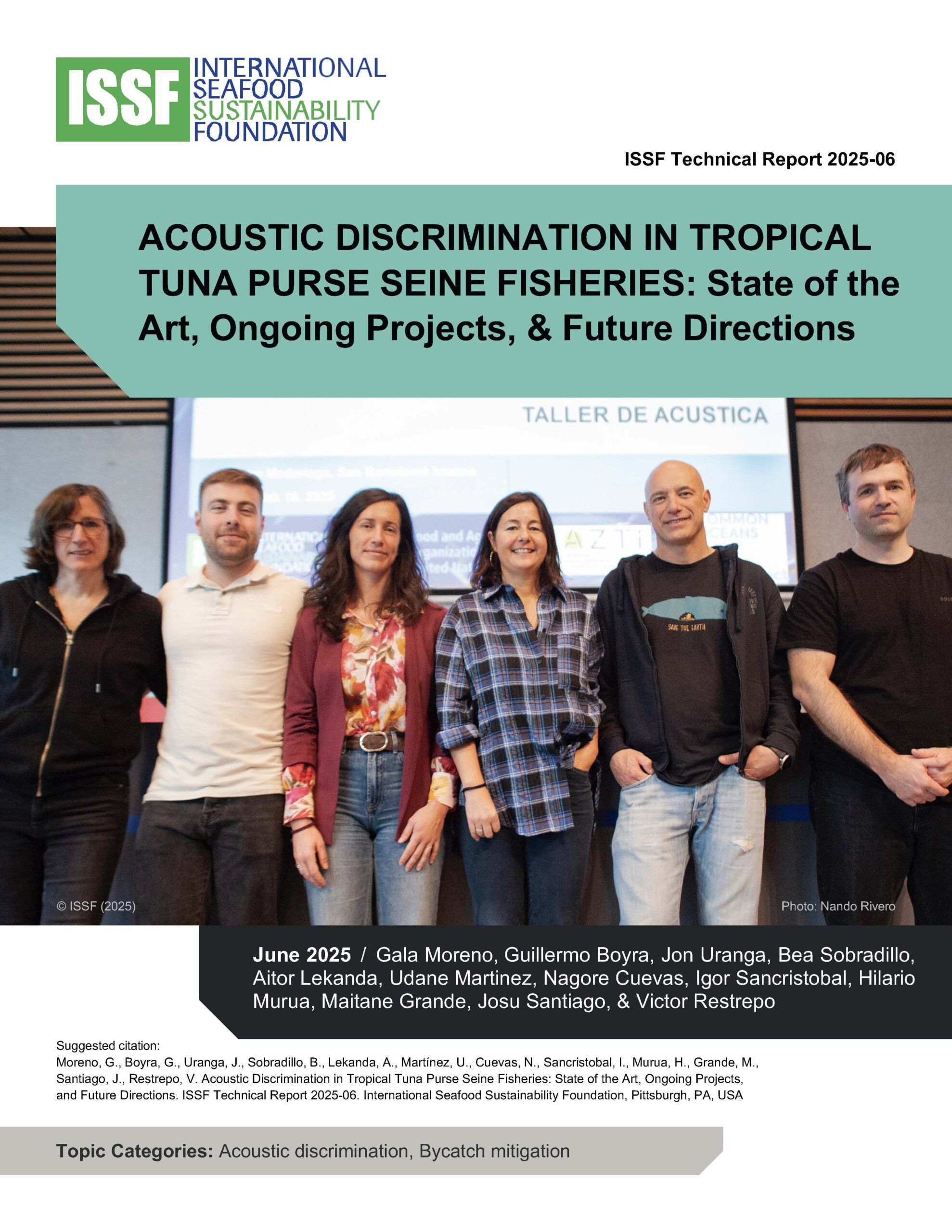 Moreno, G., Boyra, G., Uranga, J., Sobradillo, B., Lekanda, A., Martínez, U., Cuevas, N., Sancristobal, I., Murua, H., Grande, M., Santiago, J., Restrepo, V. Acoustic Discrimination in Tropical Tuna Purse Seine Fisheries: State of the Art, Ongoing Projects, and Future Directions. ISSF Technical Report 2025-06. International Seafood Sustainability Foundation, Pittsburgh, PA, USA