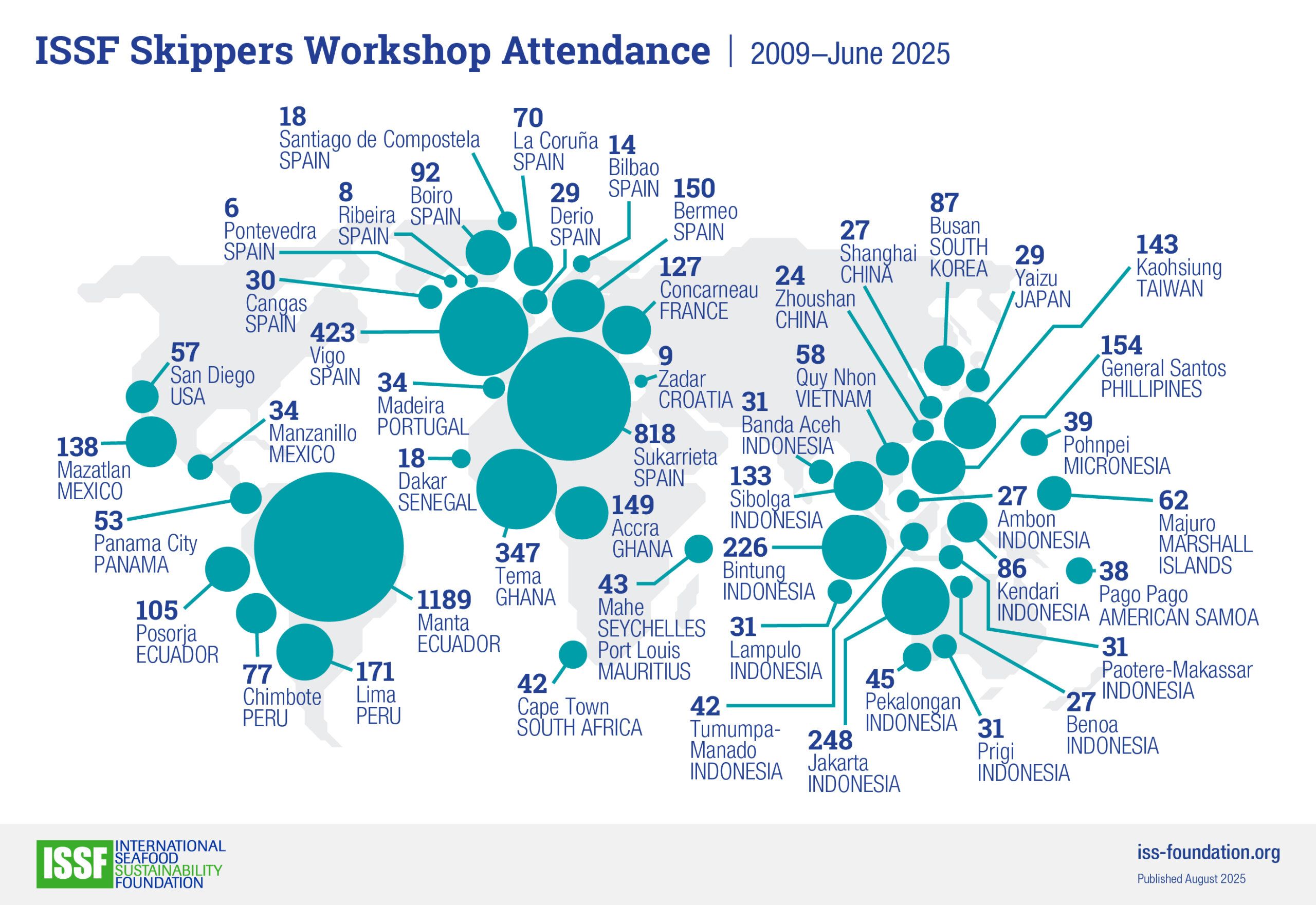 Since 2009, ISSF-sponsored scientists and presenters have been traveling the world in an effort to share best practices with fishers in every port. The Skippers Workshops are also an important opportunity for ISSF scientists to dialogue with fishers about what techniques and tools may be most impactful and most successfully implemented given the variable dynamics of the world’s tuna fisheries. These interactions, in turn, help inform ISSF’s bycatch research priorities as we continue to identify and advance sustainable fishing practices.