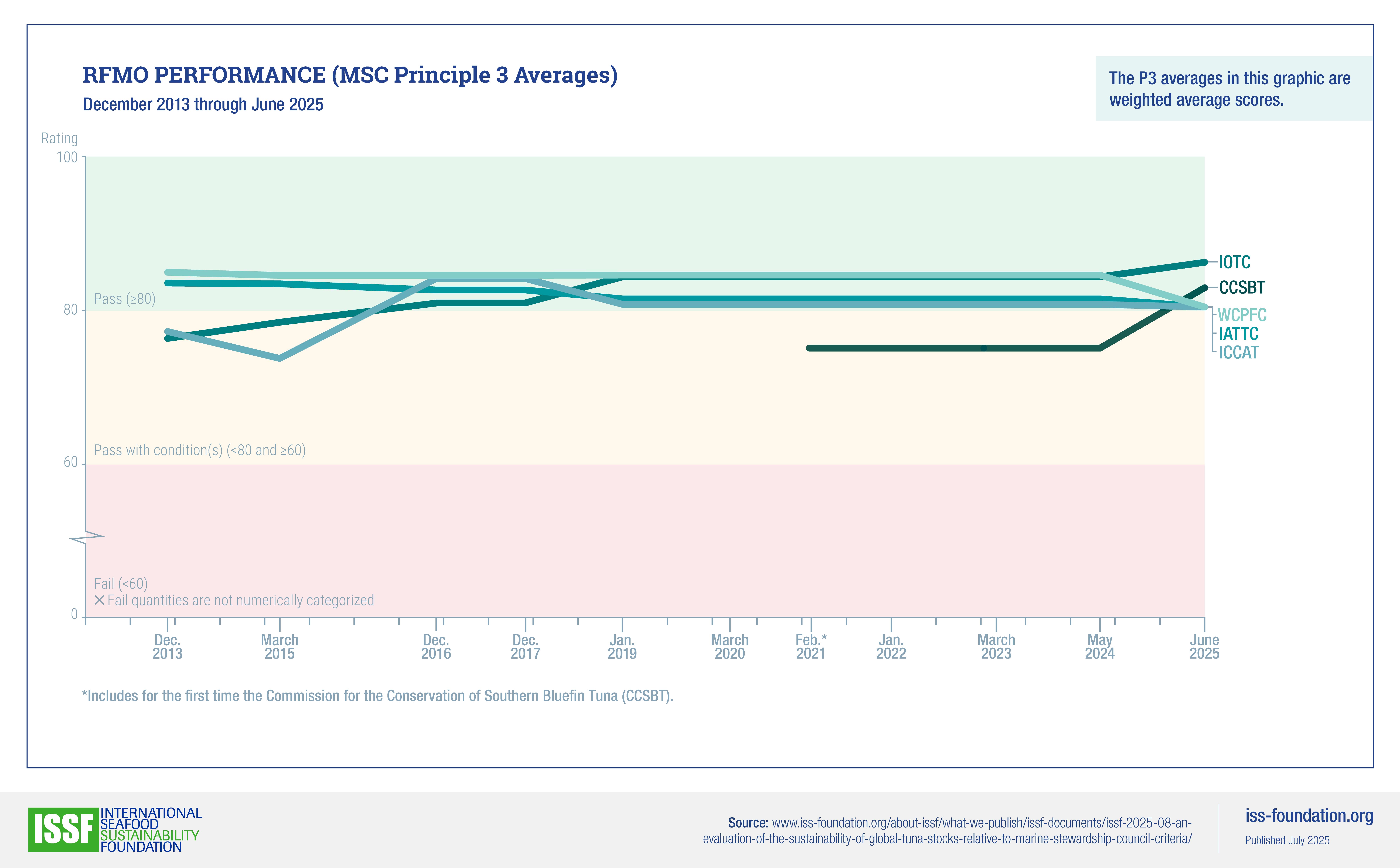 This graphic, based on data from the report, shows what the average scores for each tuna RFMO based on Principle 3 have been from 2013–2025.