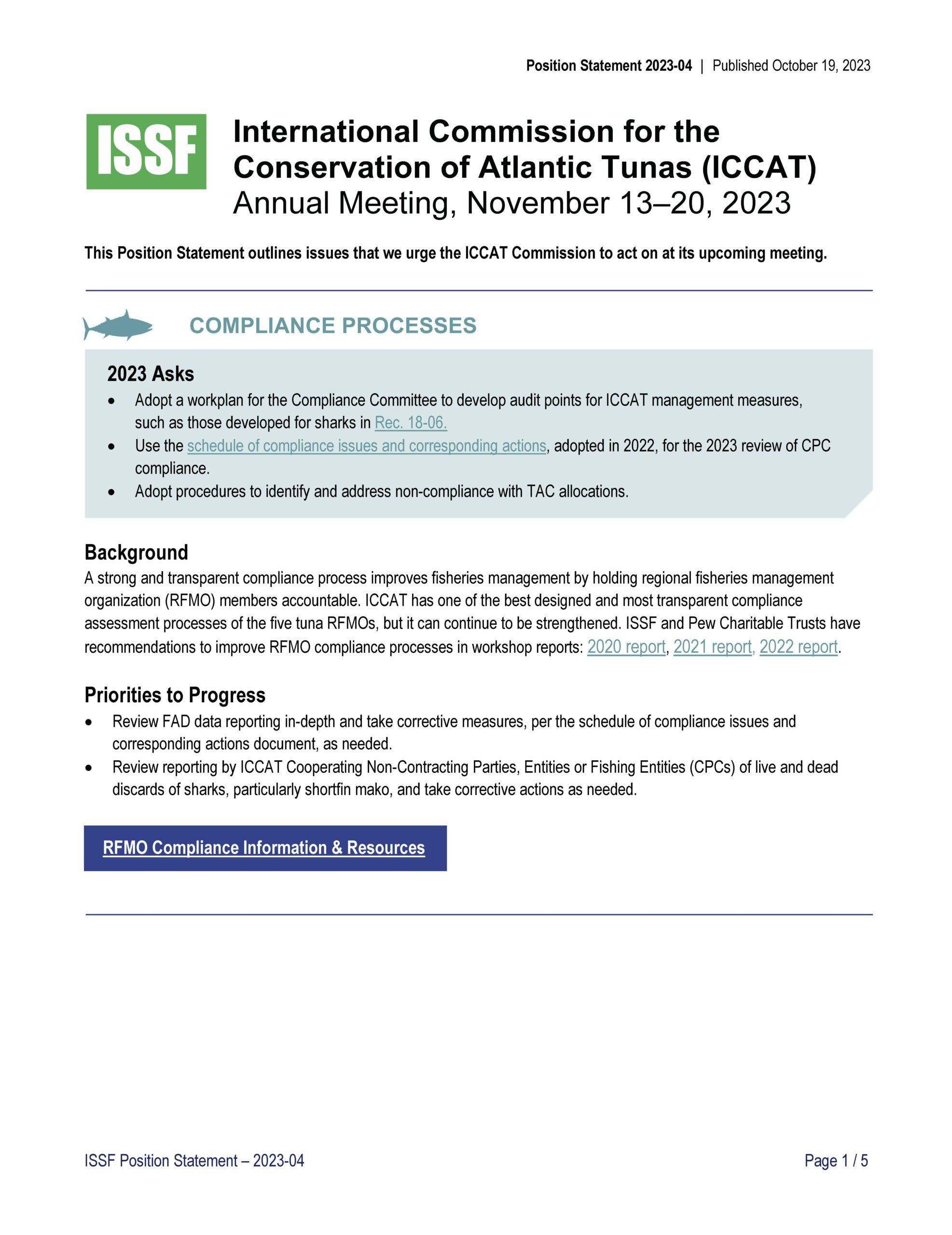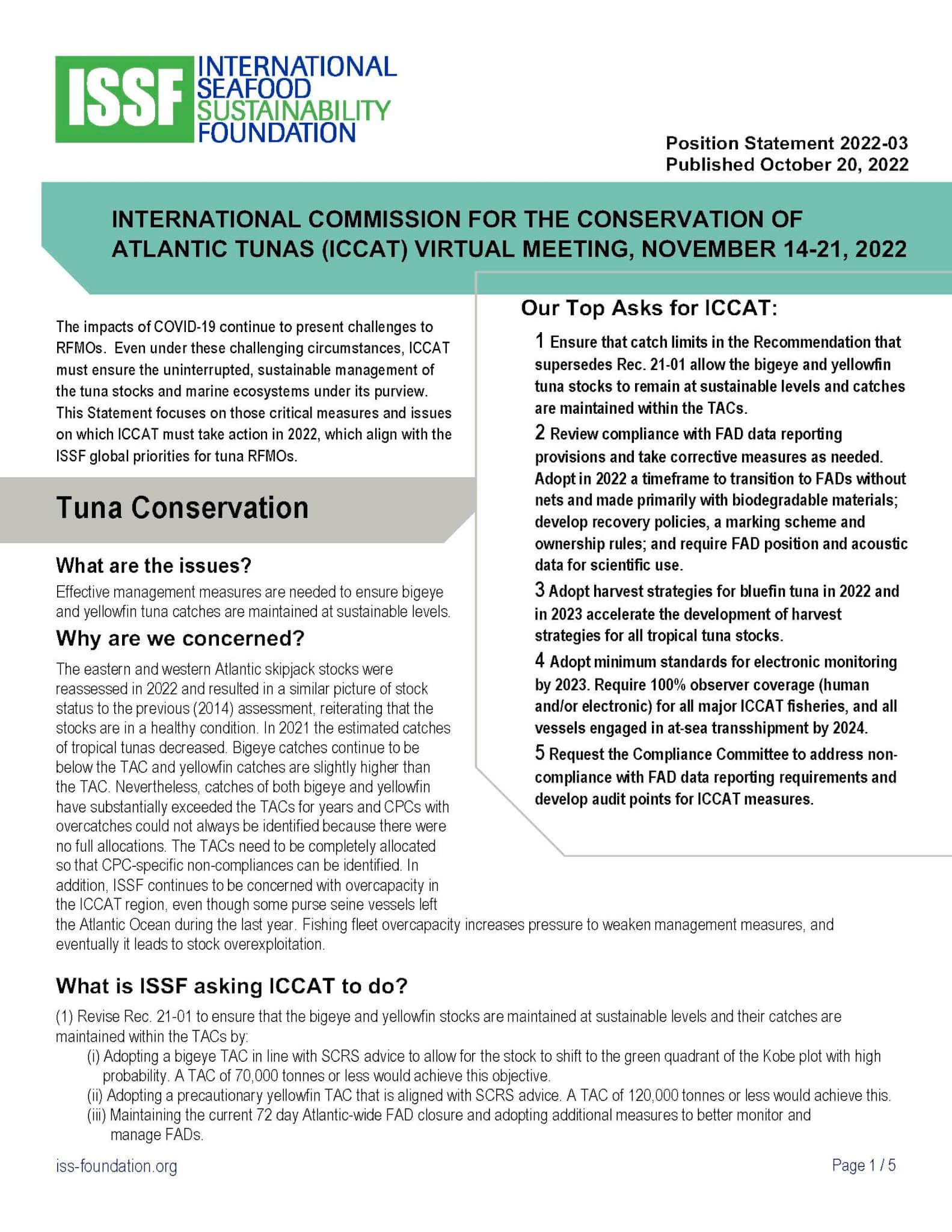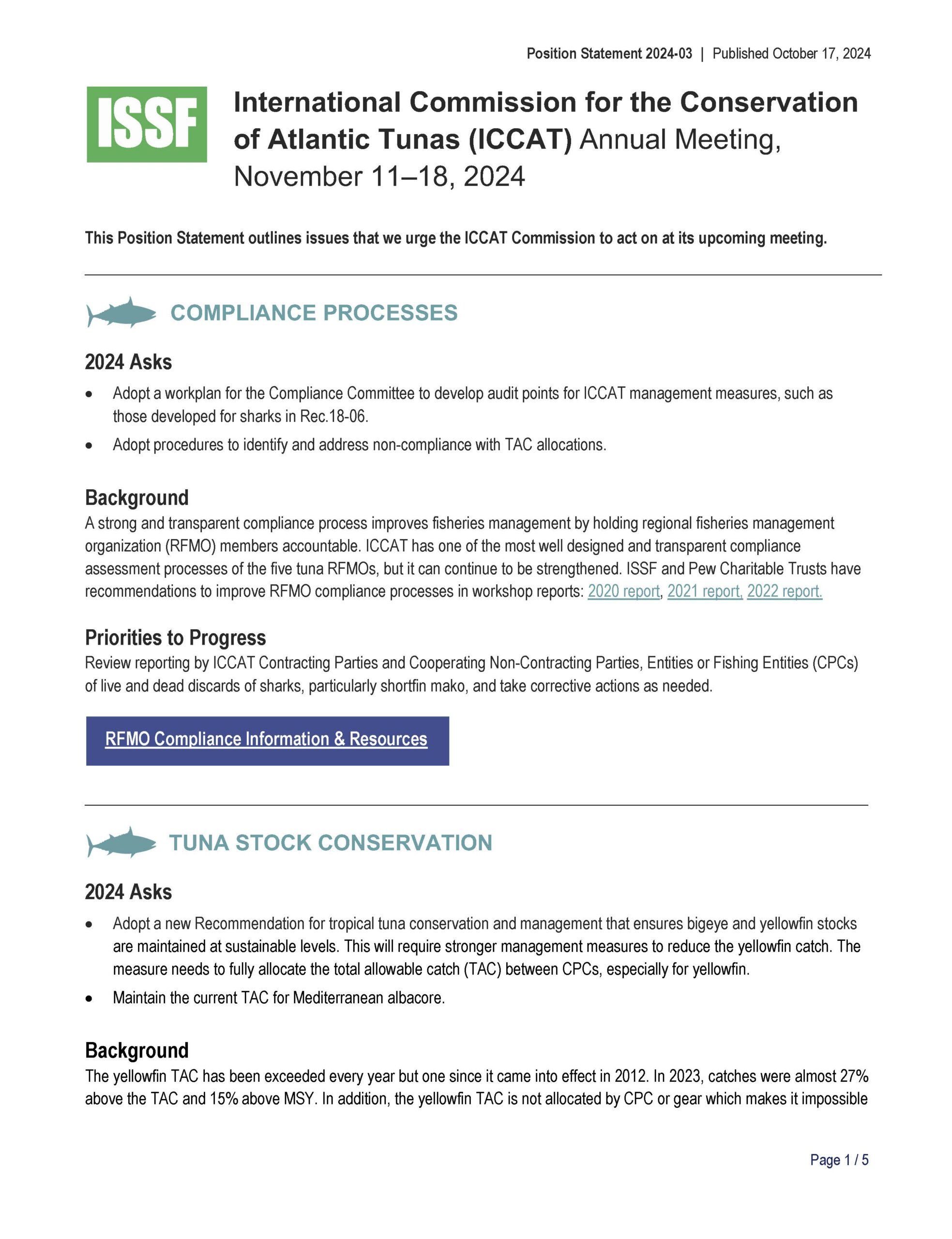 ISSF prepared this position statement for consideration at the International Commission for the Conservation of Atlantic Tunas (ICCAT) 24th regular meeting on November 11-18, 2024. The statement covers topics in these categories: compliance processes; tuna stock conservation; fish aggregating device (FAD) management; electronic monitoring and reporting and observer coverage; transshipment regulation; effective management procedures (harvest strategies); bycatch mitigation and shark protections; and capacity. The statement includes ISSF’s top “asks” or requests of ICCAT.