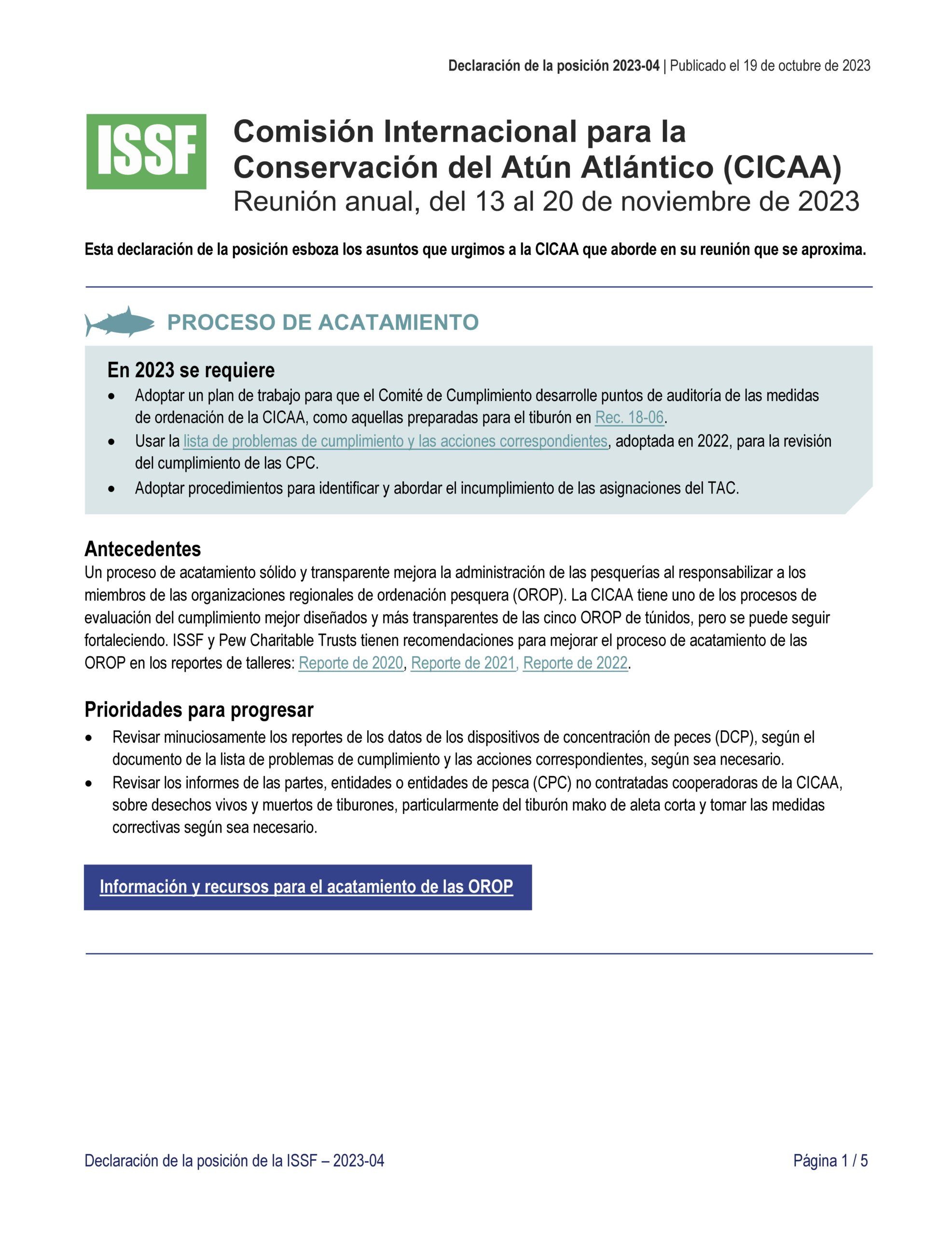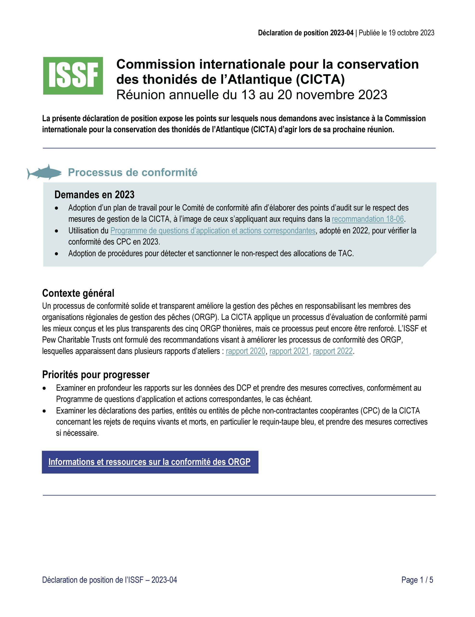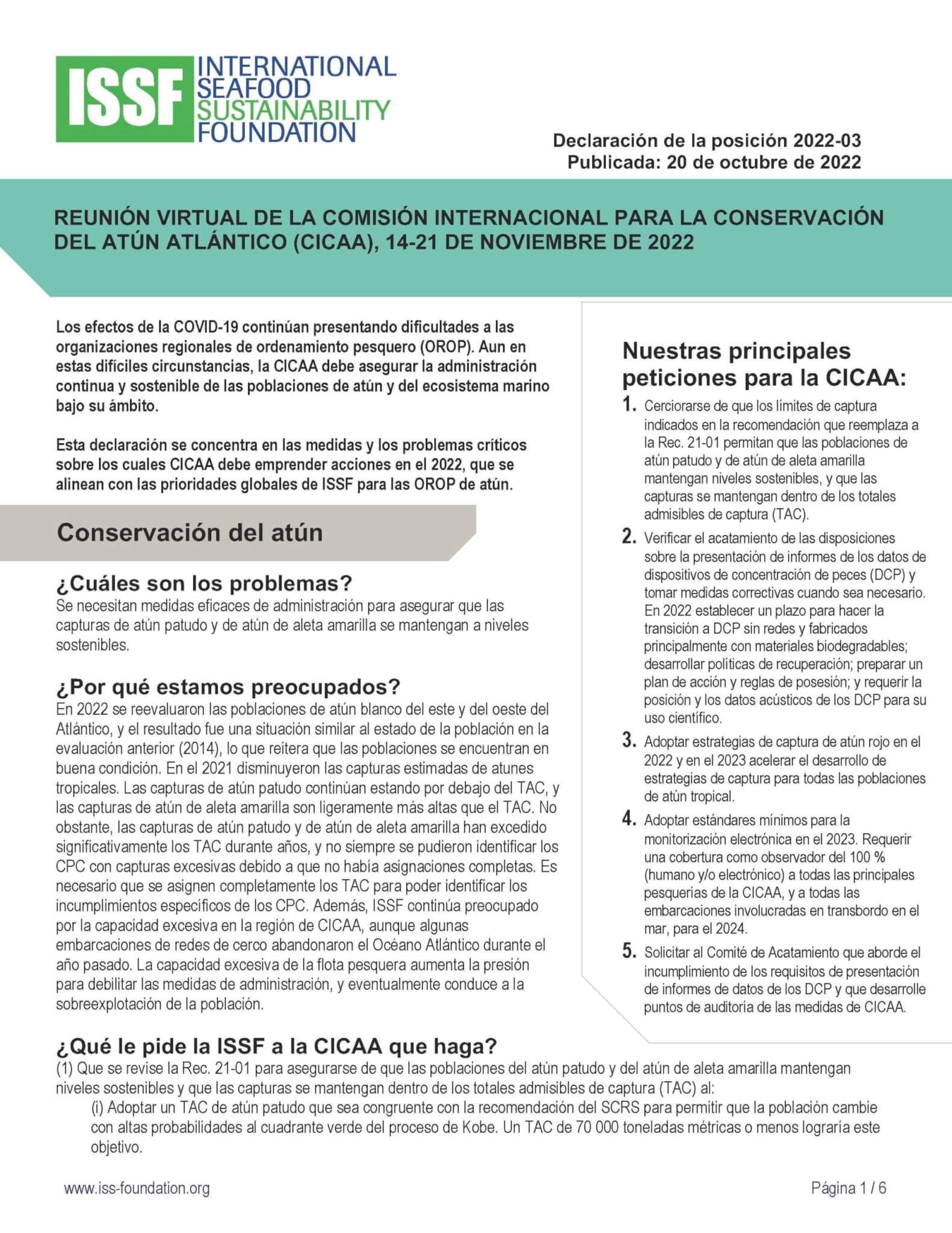 ISSF prepared this position statement for consideration at the International Commission for the Conservation of Atlantic Tunas (ICCAT) 24th regular meeting on November 11-18, 2024. The statement covers topics in these categories: compliance processes; tuna stock conservation; fish aggregating device (FAD) management; electronic monitoring and reporting and observer coverage; transshipment regulation; effective management procedures (harvest strategies); bycatch mitigation and shark protections; and capacity. The statement includes ISSF’s top “asks” or requests of ICCAT.
