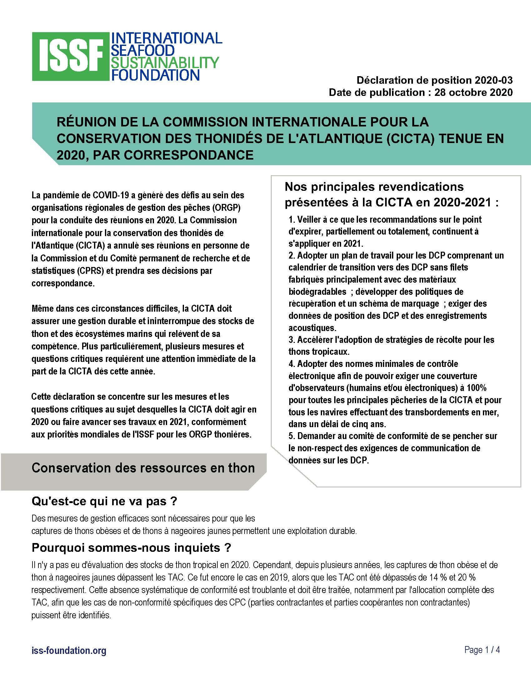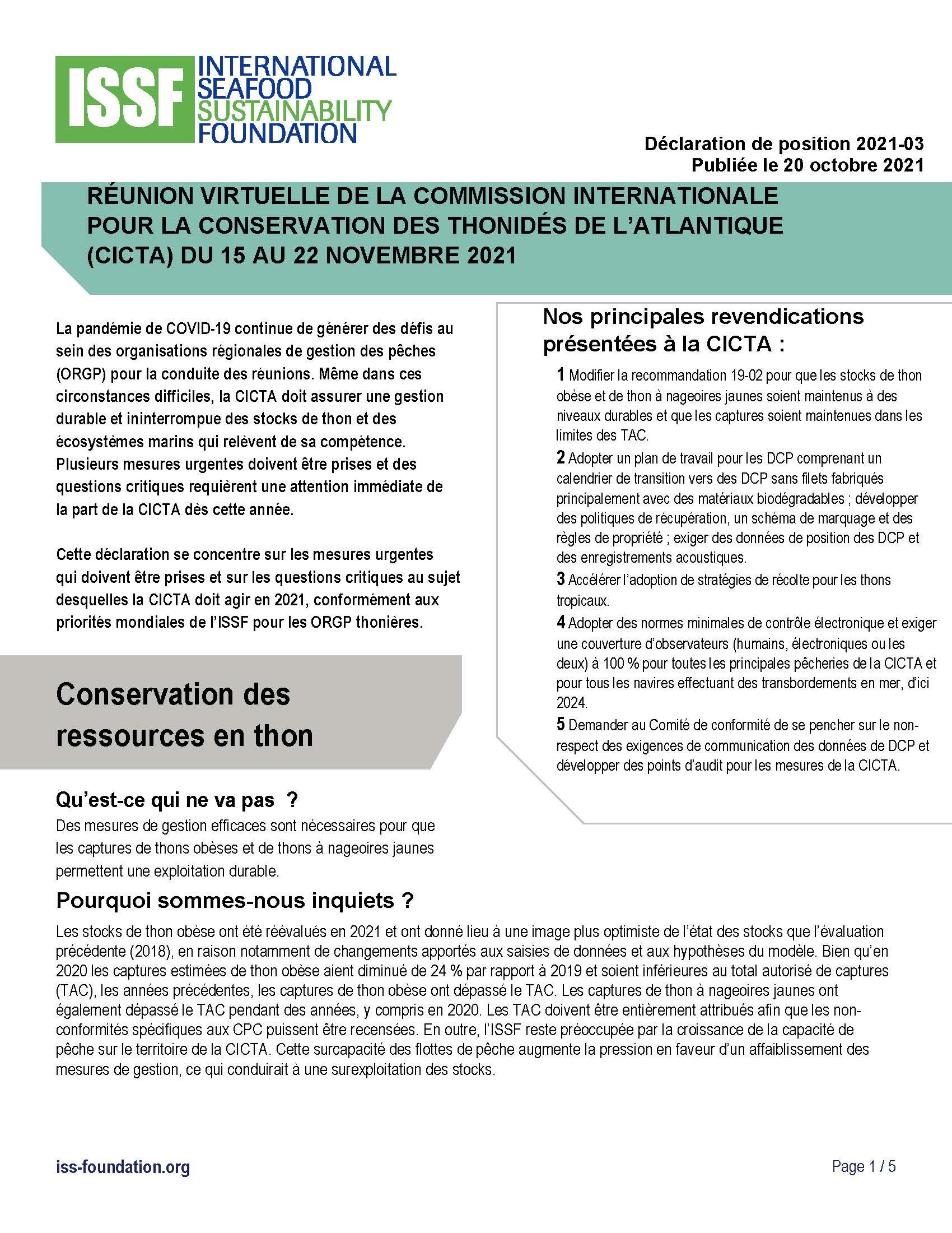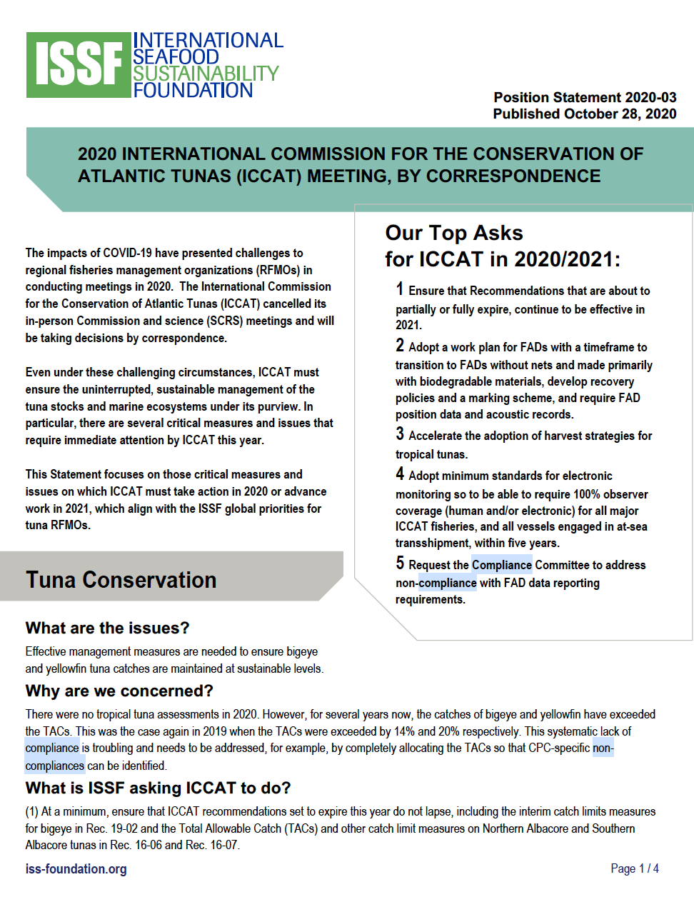 L’ISSF a préparé cette déclaration de position pour examen lors de la 27e réunion annuelle en ligne de la Commission internationale pour la conservation des thonidés de l’Atlantique (CICTA), du 15 au 22 novembre 2021. La déclaration couvre des sujets dans ces catégories: conservation du thon; dispositifs de concentration de poissons (DCP); stratégies de récolte; prises accessoires et requins; suivi, contrôle et surveillance; et la conformité.