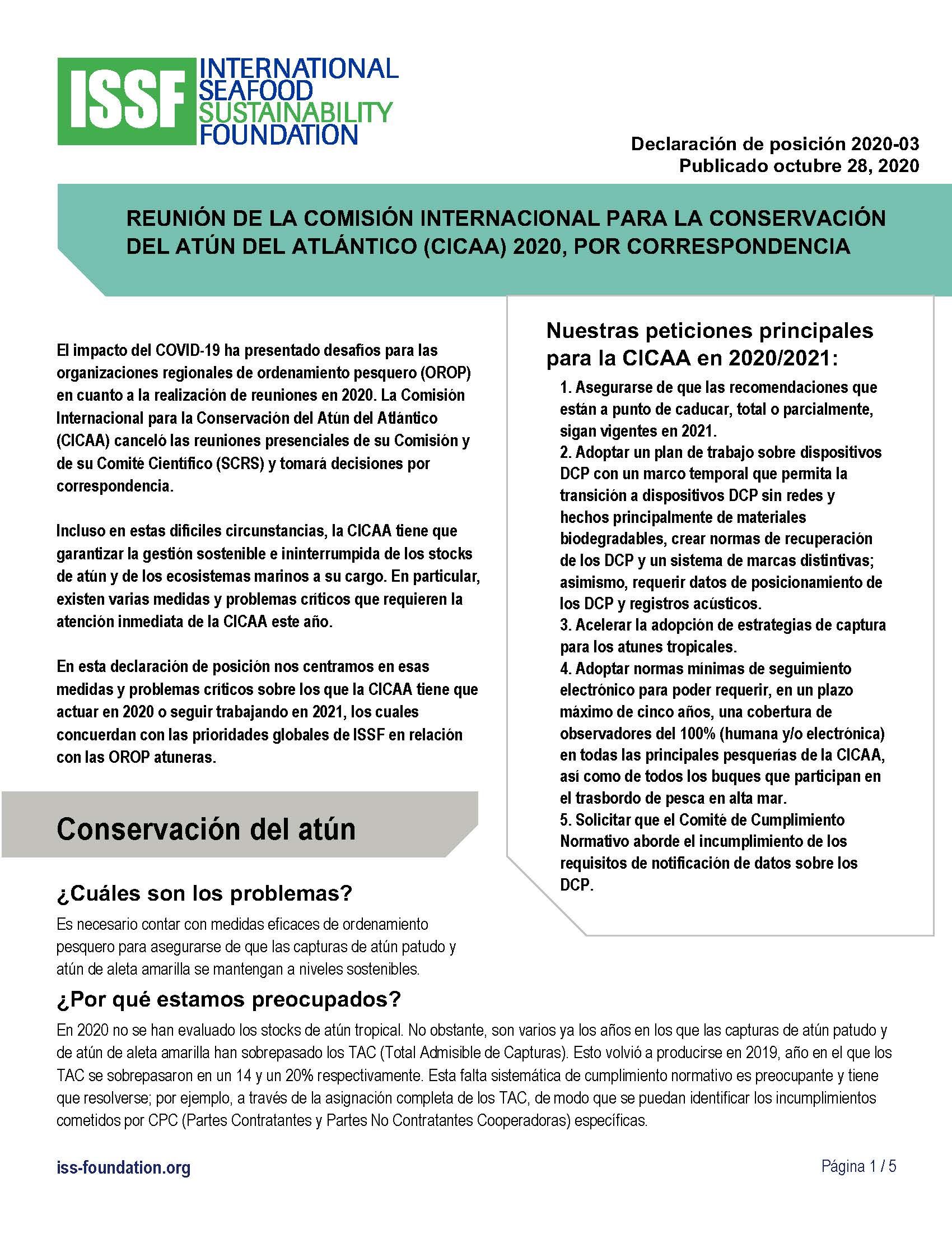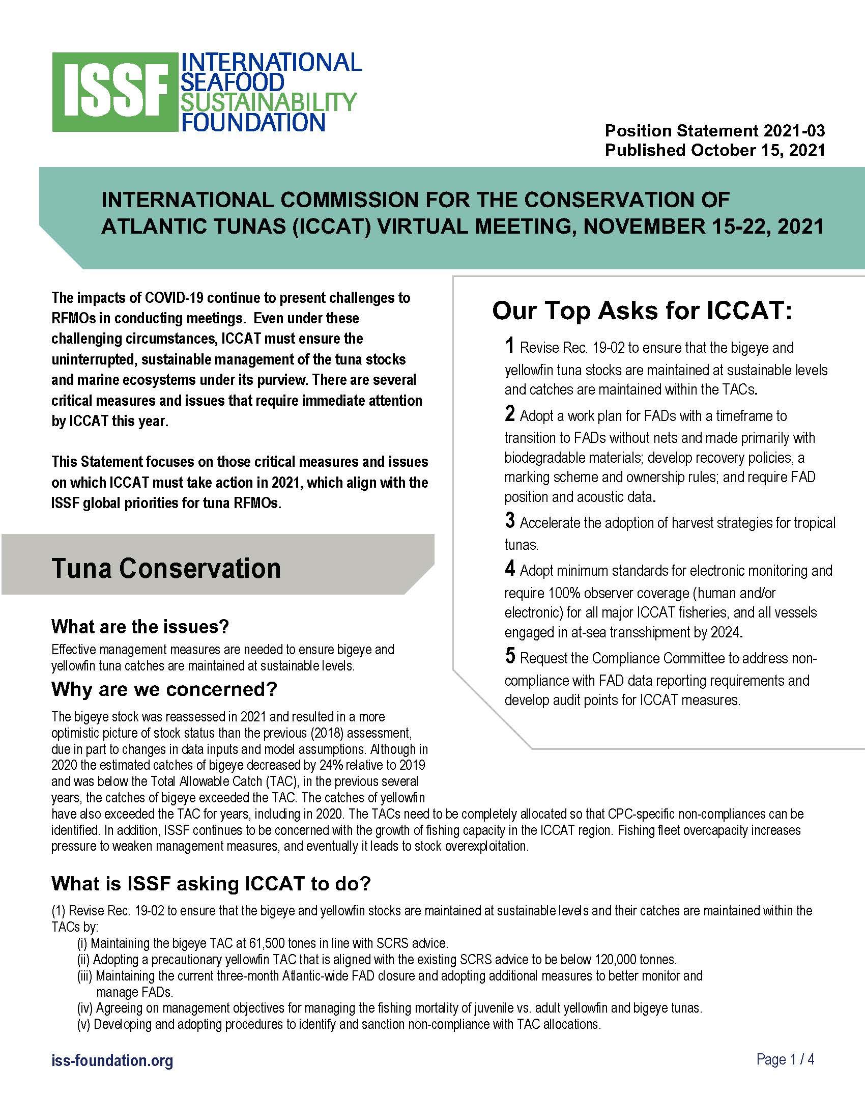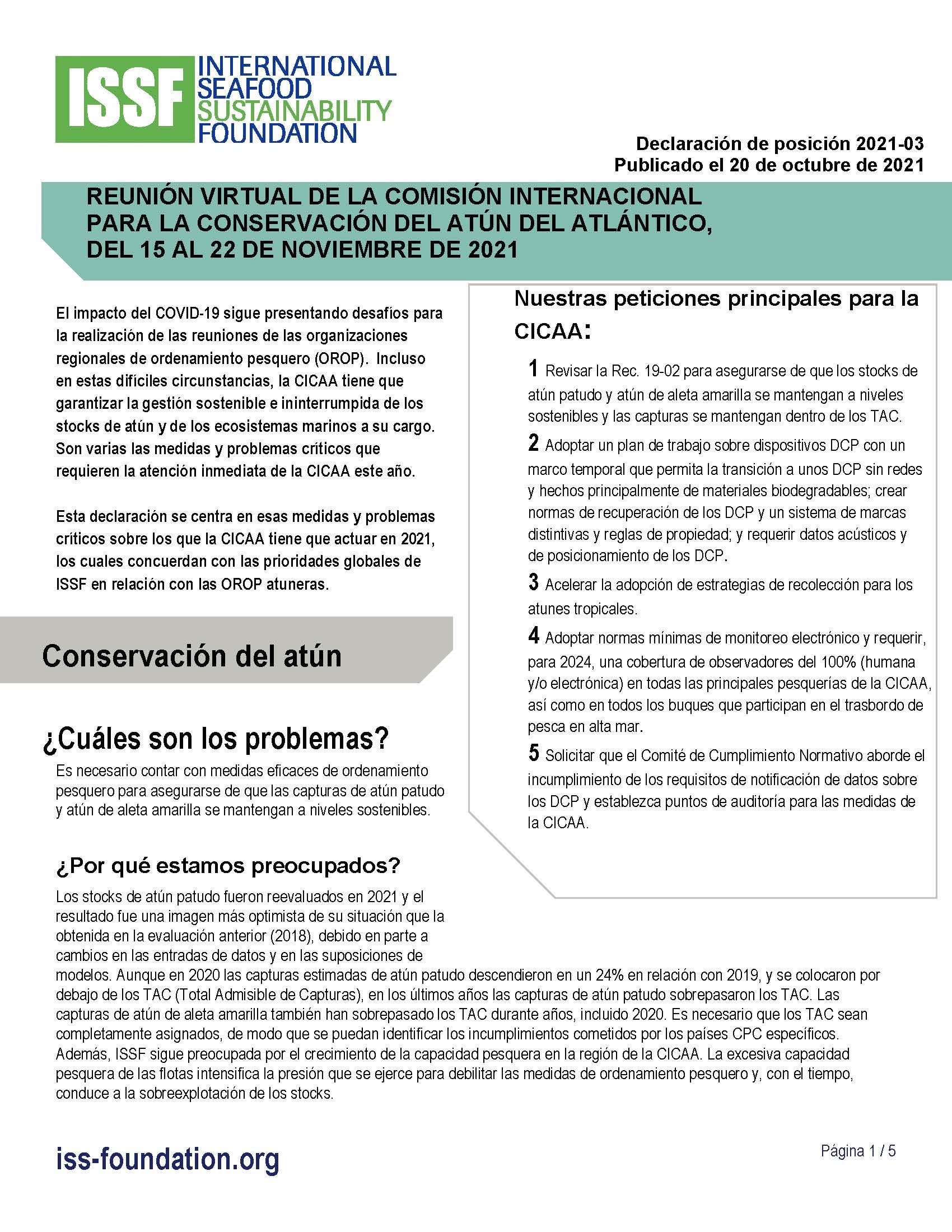L’ISSF a préparé cette déclaration de position pour examen lors de la 27e réunion annuelle en ligne de la Commission internationale pour la conservation des thonidés de l’Atlantique (CICTA), du 15 au 22 novembre 2021. La déclaration couvre des sujets dans ces catégories: conservation du thon; dispositifs de concentration de poissons (DCP); stratégies de récolte; prises accessoires et requins; suivi, contrôle et surveillance; et la conformité.